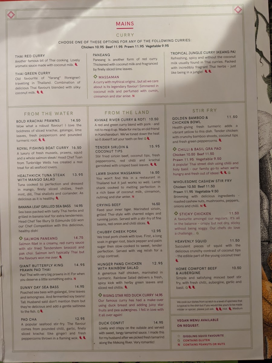 Located at 24 West St, Marlow, Giggling Squid offers a delightful journey through Thai cuisine, where each dish is crafted with fresh, quality ingredients. From Massaman Prawn Curry—a rich and aromatic blend simmered with coconut milk and spices—to the unexpected yet delicious Salmon Paneang, the menu showcases traditional flavors with a modern twist.